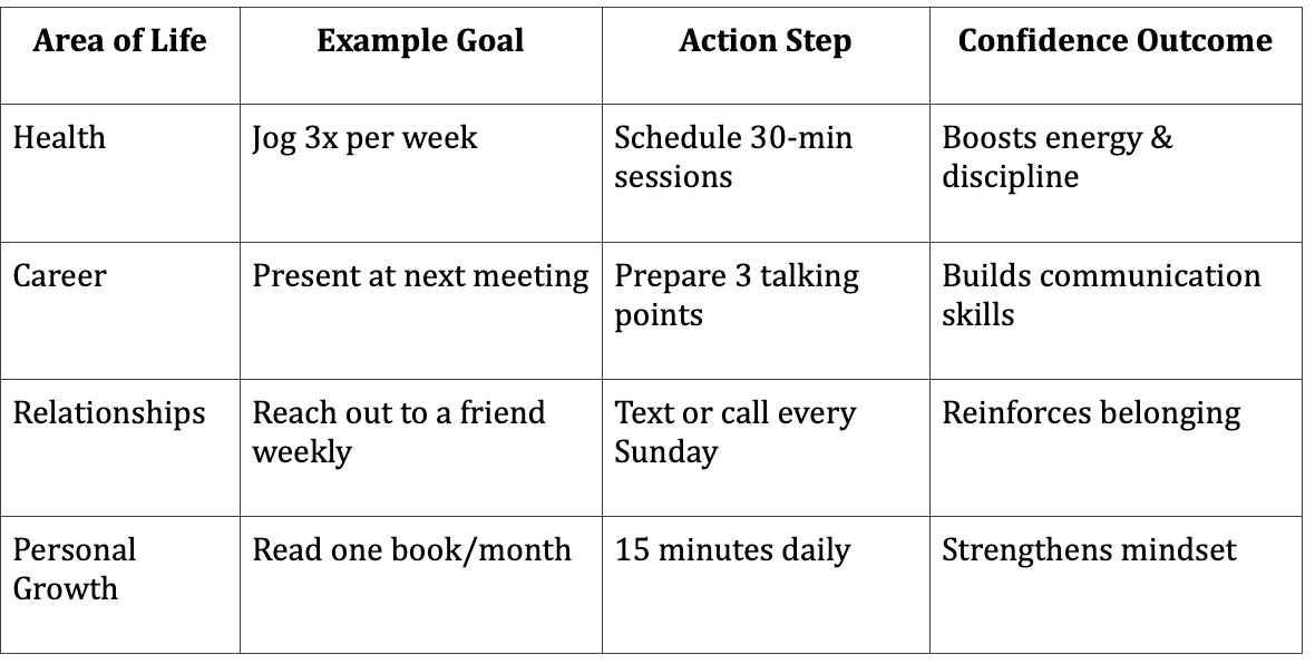 Begin with goals that stretch you slightly outside your comfort zone — not so big they overwhelm you. Whether it’s speaking up in a meeting or running your first mile, small victories accumulate into inner trust.